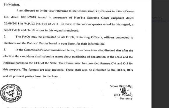 തിരഞ്ഞെടുപ്പ് കമ്മീഷൻെറ കത്തിൽ ബിജെപി കേരള ഘടകത്തിന്റെ സീൽ; ക്ലറിക്കൽ പിഴവ് എന്ന് വിശദീകരണം