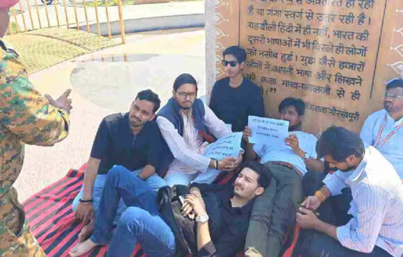 ഭോപ്പാലിലെ മഖന്ലാല് ചതുര്വേദി നാഷണല് യൂണിവേഴ്സിറ്റി ഓഫ് ജേണലിസം ആന്ഡ് കമ്യൂണിക്കേഷന് ക്യാംപസിനുള്ളില് ഗോശാല നിര്മിക്കണമെന്നാവശ്യപ്പെട്ട് സമരവുമായി കോണ്ഗ്രസ് വിദ്യാര്ത്ഥി