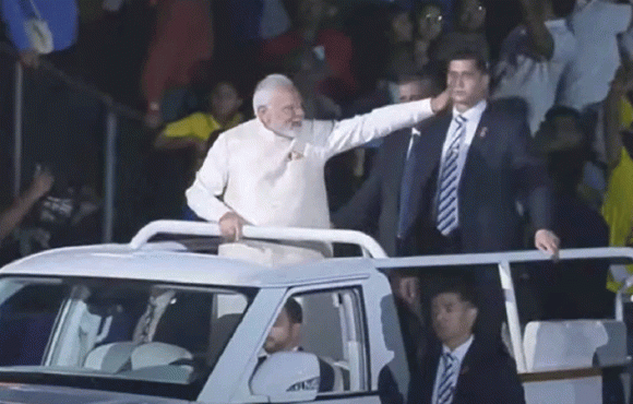 ഇവിടുത്തെ സായിദ് സ്പോർട്സ് സിറ്റി സ്റ്റേഡിയത്തിൽ 'മോദി, മോദി' എന്ന വിളികൾക്കിടയിൽ ആയിരക്കണക്കിന് വരുന്ന സദസ്സുകളെ