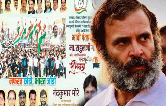 നഫ്രത് ജോഡോ, ഭാരത് ജോഡോ എന്ന അടിക്കുറിപ്പിലാണ് ഫ്ലക്സ് സ്ഥാപിച്ചത്. രാഹുലിനൊപ്പം നിരവധി പ്രാദേശിക നേതാക്കളുടെ ചിത്രങ്ങളും ഫ്ലക്സ് ബോർഡിലുണ്ട്.