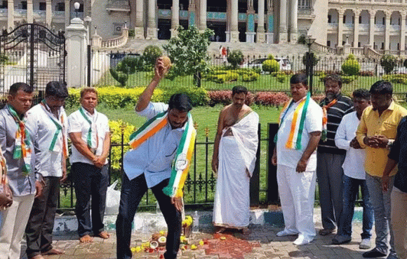 നിയമസഭാ സമ്മേളനം തുടങ്ങുന്നതിന് തൊട്ടുമുമ്പ് കോൺഗ്രസ് പ്രവർത്തകർ എത്തി നിയമസഭയ്ക്ക് പുറത്ത് ഗേറ്റിന് സമീപം ഗോമൂത്രം തളിച്ച് സഭ പ്രതീകാത്മകമായി