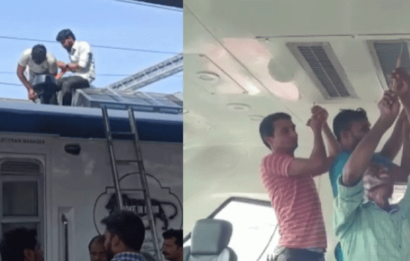 മഴ പെയ്തതിനെ തുടർന്ന് എക്സിക്യൂട്ടീവ് കോച്ചിൽ ഒന്നിന്റെ എസി ഗ്രില്ലിൽ നിന്ന് വെള്ളം കോച്ചിനുള്ളിലേക്ക് വീഴുന്നത് കണ്ട് ചോർച്ചയെന്നു ചിലർ