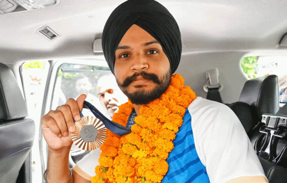 മിക്സഡ് ടീം 10 മീറ്റർ എയർ പിസ്റ്റൾ ഇനത്തിൽ വെങ്കല മെഡൽ ജേതാവ്, മനു ഭാക്കറിനൊപ്പം, ഇന്ത്യയുടെ ഷൂട്ടർ സരബ്ജോത്