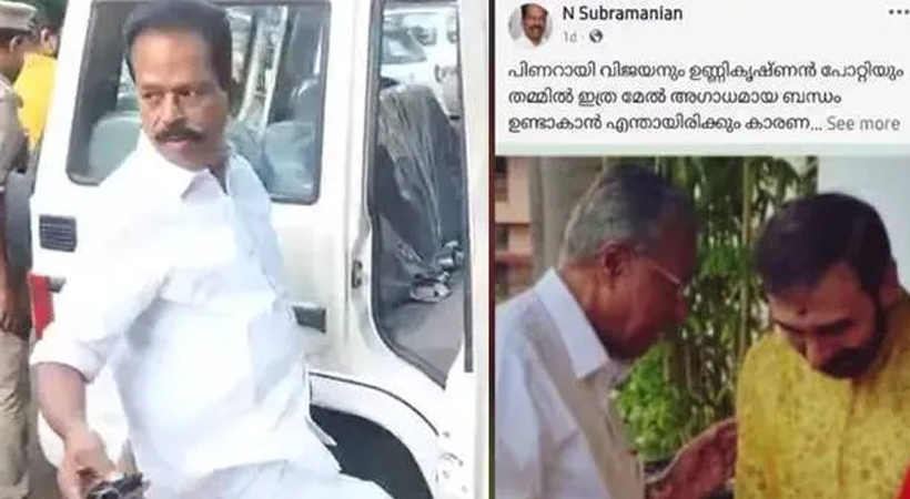 മുഖ്യമന്ത്രി പിണറായി വിജയനും ഉണ്ണിക്കൃഷ്ണൻ പോറ്റിയും ഒന്നിച്ചുള്ള ചിത്രം വക്രീകരിച്ച് സോഷ്യൽ മീഡിയയിൽ പ്രചരിപ്പിച്ചെന്ന പരാതിയിൽ കെപിസിസി രാഷ്ട്രീയകാര്യ സമിതി അംഗം എൻ. സുബ്രഹ്മണ്യനെ ചേവായൂർ പോലീസ് കസ്റ്റഡിയിലെടുത്തു.
