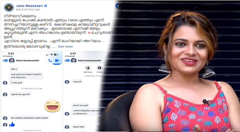 ‘നീ വല്ലാത്ത സാധനമാണല്ലോ കൊച്ചേ’; രാഹുലിന്റെ ചാറ്റ് പുറത്ത് വിട്ട് ജസ്ല മാടശേരി