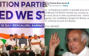 ദില്ലി: പ്രതിപക്ഷ സഖ്യ പേരിനെ ചൊല്ലി വിവാദം.ഇന്ത്യ എന്ന പേര് ബ്രിട്ടീഷുകാരുടെ സംഭാവനയെന്ന് അസം മുഖ്യമന്ത്രി ഹിമന്ദ ബിശ്വ ശർമ