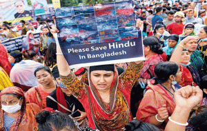 പ്രധാനമന്ത്രി ഷെയ്ഖ് ഹസീനയെ പുറത്താക്കി ഇടക്കാല സർക്കാർ സത്യപ്രതിജ്ഞ ചെയ്തതിന് പിന്നാലെ റിപ്പോർട്ട് ചെയ്യപ്പെട്ട വർഗീയ കലാപത്തിൽ ബംഗ്ലാദേശിൽ പ്രതിഷേധം
