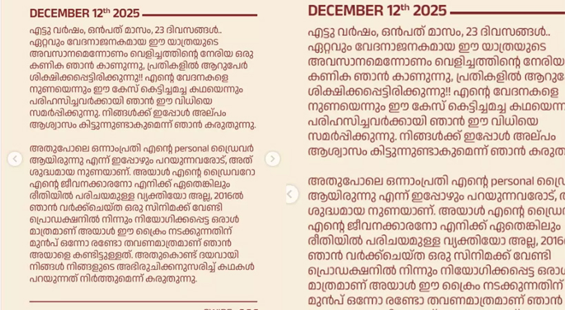 അതുപോലെ ഒന്നാംപ്രതി എന്റെ personal ഡ്രൈവർ ആയിരുന്നു എന്ന് ഇപ്പോഴും പറയുന്നവരോട്, അത് ശുദ്ധമായ നുണയാണ്. അയാൾ എന്റെ ഡ്രൈവറോ എന്റെ ജീവനക്കാരനോ എനിക്ക് ഏതെങ്കിലും രീതിയിൽ പരിചയമുള്ള വ്യക്തിയോ അല്ല, 2016ൽ ഞാൻ വർക്ക്ചെയ്ത ഒരു സിനിമക്ക് വേണ്ടി പ്രൊഡക്ഷനിൽ നിന്നും നിയോഗിക്കപ്പെട്ട ഒരാൾ മാത്രമാണ് അയാൾ ഈ ക്രൈം നടക്കുന്നതിന് മുൻപ് ഒന്നോ രണ്ടോ തവണമാത്രമാണ് ഞാൻ അയാളെ കണ്ടിട്ടുള്ളത്. അതുകൊണ്ട് ദയവായി നിങ്ങൾ നിങ്ങളുടെ അഭിരുചിക്കനുസരിച്ച് കഥകൾ പറയുന്നത് നിർത്തുമെന്ന് കരുതുന്നു.